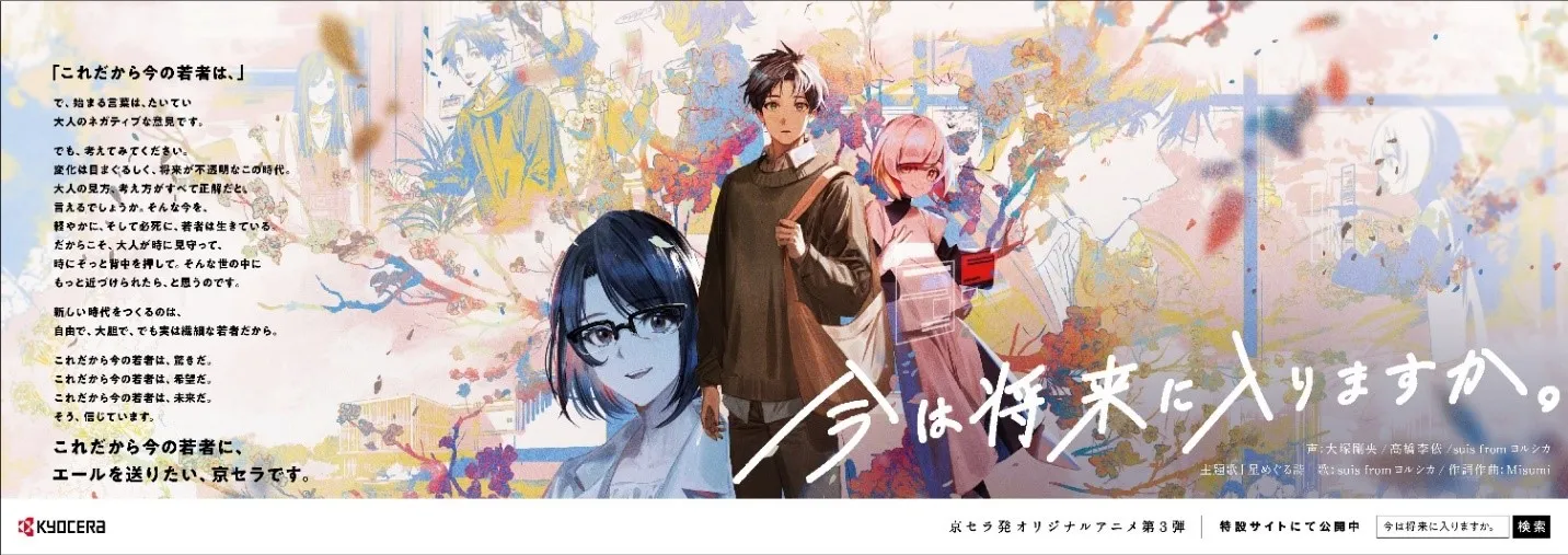 京セラ株式会社は、2024年2月20日(火)から特設サイトにて公開しているオリジナルアニメーション第3弾『今は将来に入りますか。』との連動企画として、3月1日(金)から、「これだから今の若者は、」をキーワードにしたポジティブなメッセージ広告を東京メトロ東西線にて掲載いたします。