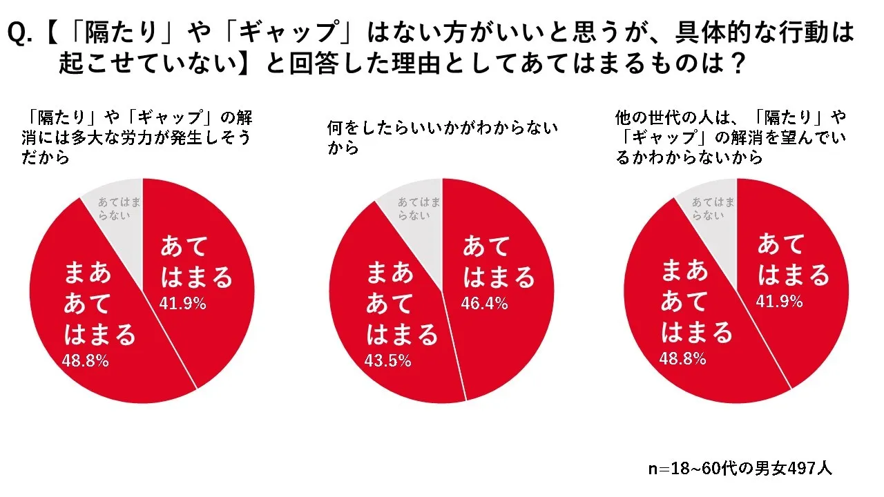 世代間の「隔たり」や「ギャップ」を実感している回答者のうち、2人に1人は、『世代間の「隔たり」や「ギャップ」をつくらずに、もっと分かち合いたい』と思いながらも『具体的な行動は起こせていない』ことが明らかになりました。一方、大きな影響力をもつ企業組織に世代間におけるコミュニケーション問題の解消を期待する側面があることも分かりました。