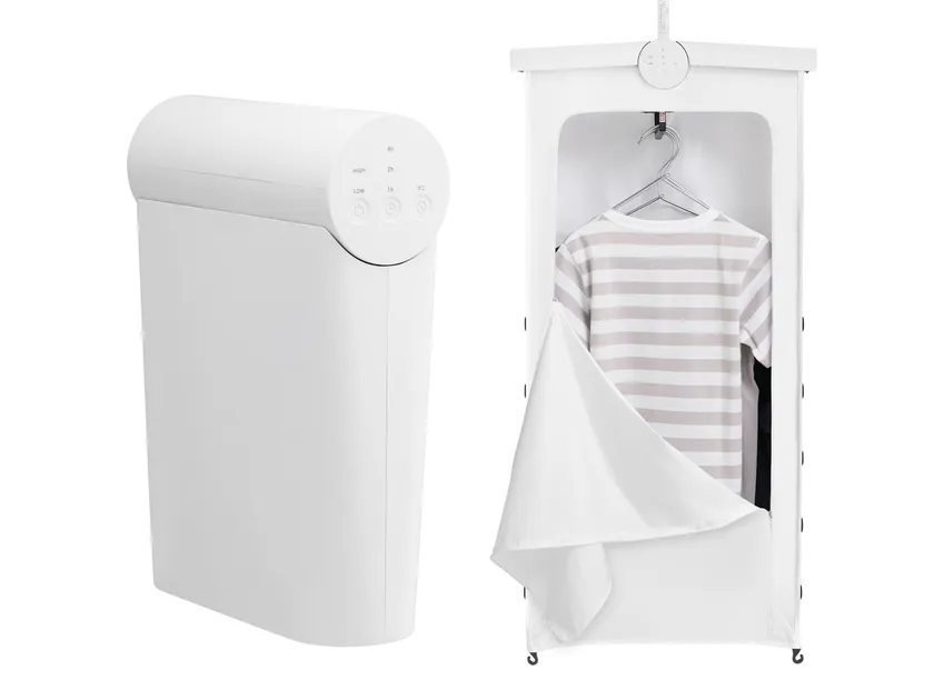 折りたたみ式の小型衣類乾燥機は、花粉シーズンや雨の日の部屋干しに便利。