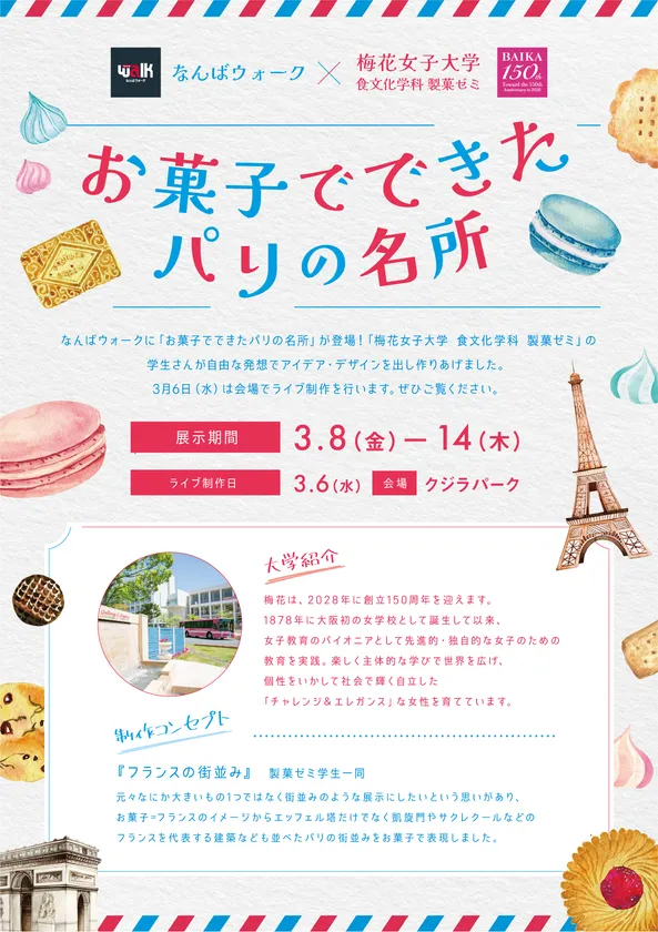大阪地下街株式会社が運営する「なんばウォーク」(大阪市中央区)は、梅花女子大学 食文化学科 製菓ゼミとコラボレーションし、「お菓子でできたパリの名所」を作成・館内に展示いたします。学生が自由な発想でアイデア・デザインを出し作りあげた作品をぜひご覧ください。
