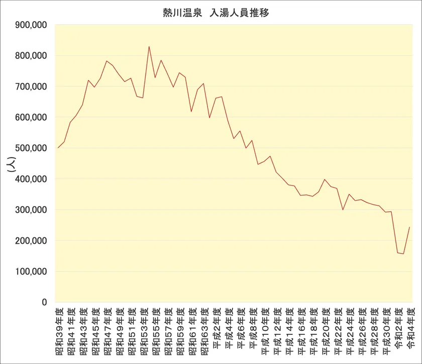 しかしながら、昭和54年(1979年)をピークに熱川温泉の入湯者は減少し続けています。