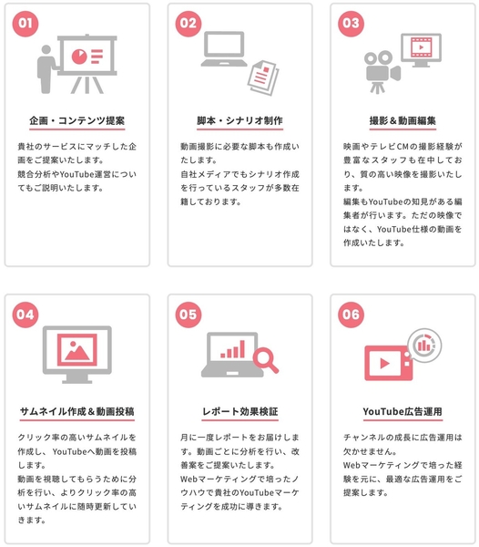 そこで培った実績とともに「売上に直結する問題解決」と「根本問題を解決する分析力」を強みとしてYouTubeマーケティング事業を行っております。チャンネルの企画力・制作力・分析力を基盤とし、企画から制作、編集、運用までワンストップで支援を行っています。