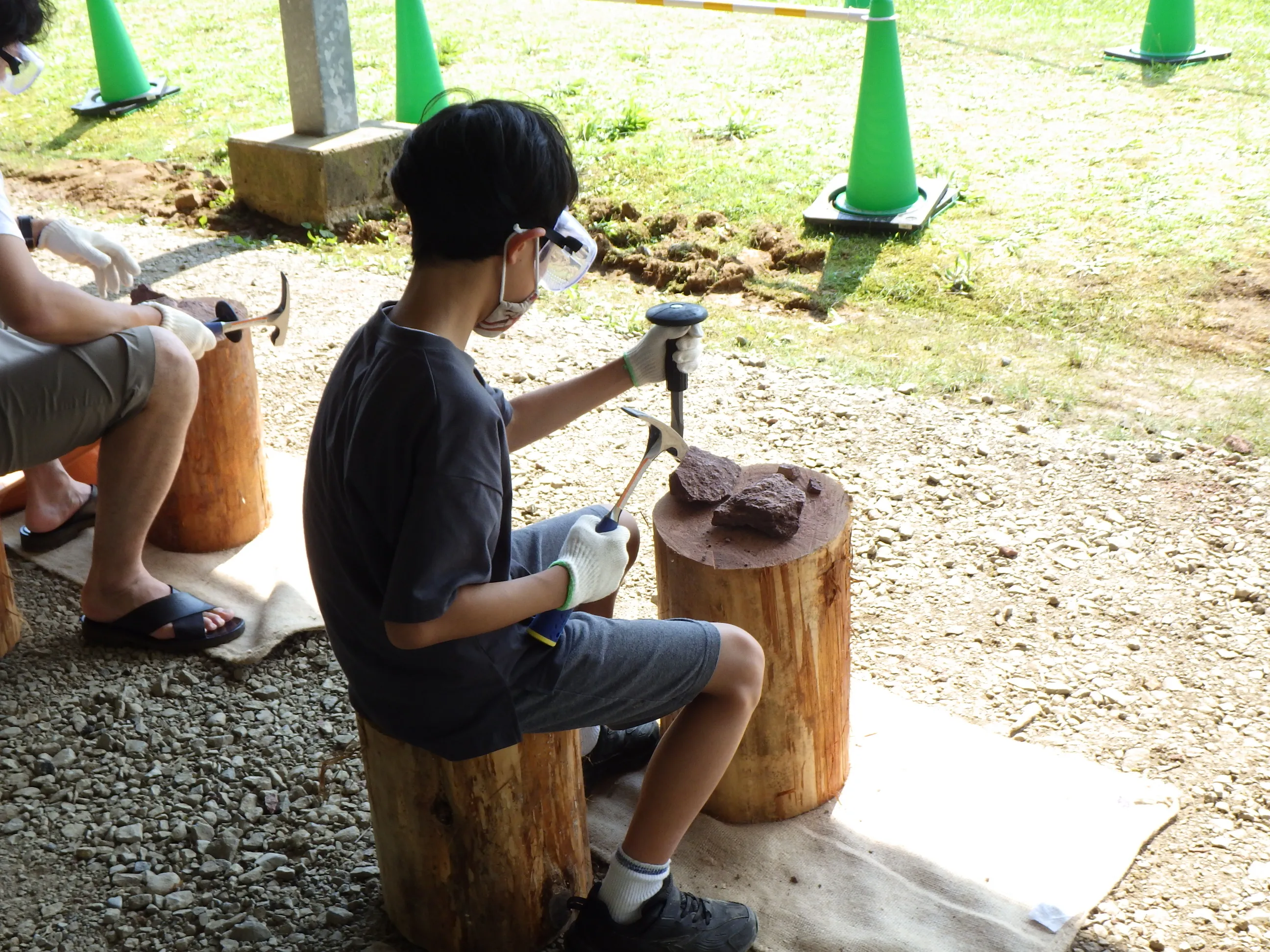 タイの発掘現場から持ってきた石を叩いて、“ホンモノ”の恐竜化石を発掘できるか?!化石を見つけたら、福井県立恐竜博物館の研究員から詳しい解説を聞くことができる貴重な体験