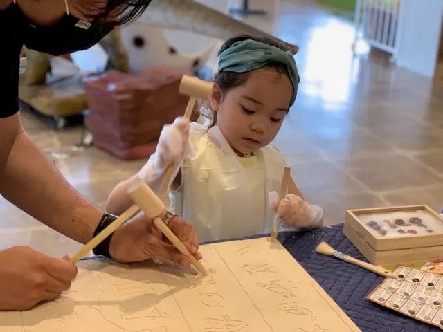 ハンマーとノミを使い、プレートに埋められた本物の化石や鉱石を自分の手で発掘するワークショップです。出てきた化石・鉱石は発掘後にお持ち帰りいただけます。さらに今回、本物のトリケラトプスの化石発掘体験を数量限定でご用意しました。