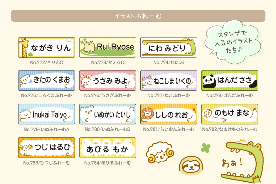 当店人気の「ぷちシリーズ」に新しいデザインが仲間入り。“おむつ名前スタンプ”で人気のゆるーいフォルムの中にお名前が入るシリーズが登場しました!スタンプとは違いカラフルになり、さらに可愛さが増しています。また、文字の読めない0歳〜3歳ごろのお子さまもフォルムで認識しやすいためマイマークとしてもお使いいただけます。