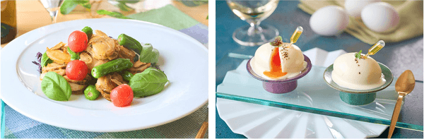 左:【カチャトラ風チキンのソテー 山椒の香り】。皮目をパリパリに焼き上げた鶏肉に、隠し味に山椒を加えたトマトソースを添えて。山椒のピリリとした辛みが感じられる、夏にぴったりのメニューです。