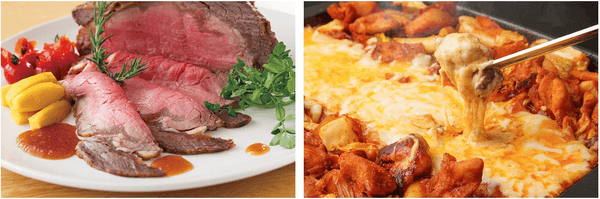 右:コチュジャンベースの甘辛ソースと、とろけるチーズの相性が抜群なチーズタッカルビはお子様も大好きな味。ビールのお供にもぴったりの美味しさです。