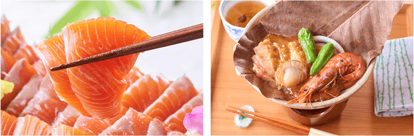 左:天然素材にこだわった餌で育てられ、養殖特有の臭みが全くない日光サーモンをお造りで。しっとりした身はそのまま召し上がるのはもちろん、ご飯に乗せてサーモン丼で楽しむのもお薦めです。