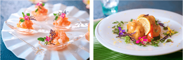 左:海老と夏野菜を使ったアミューズは、さっぱりとした味わいが夏にぴったりの一品。