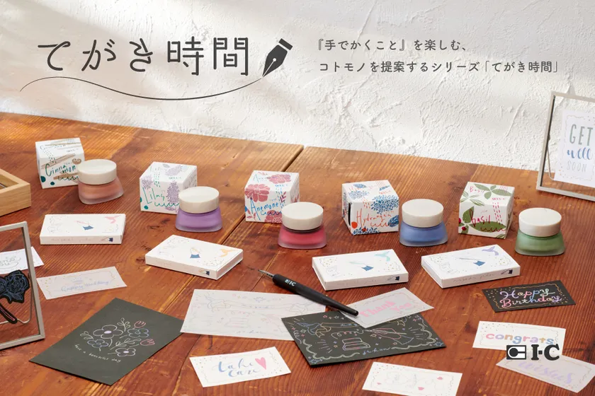 漫画画材ブランド「アイシー」を製造・販売する株式会社G-Too(本社:東京都目黒区、代表取締役社長:石井 剛太)は、『手でかくこと』を楽しむ、コトモノを提案するシリーズ『てがき時間』より、つけペン先に直接付けて描ける“てがき時間インク・くすみカラー5色”(不透明・水性顔料)と、飾り枠が箔押しされた名刺サイズのメッセージカードボックス(全4種類)を2024年3月15日(金)より一般発売いたします。