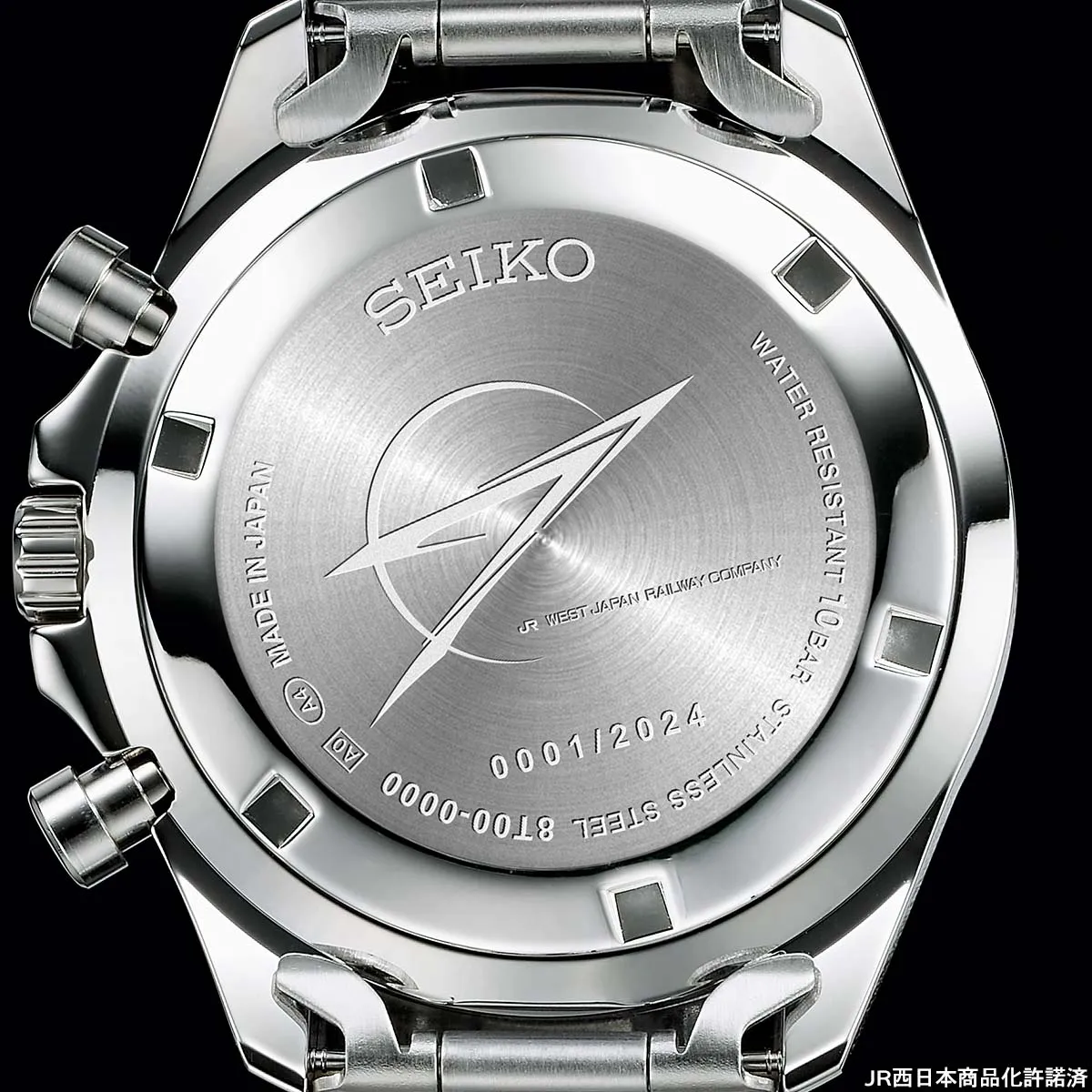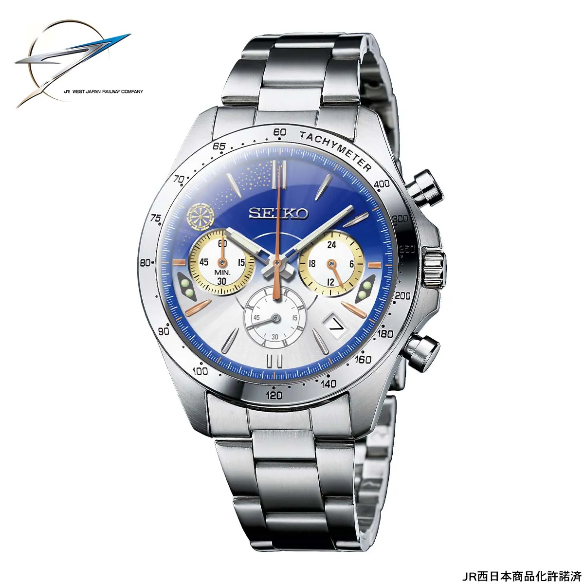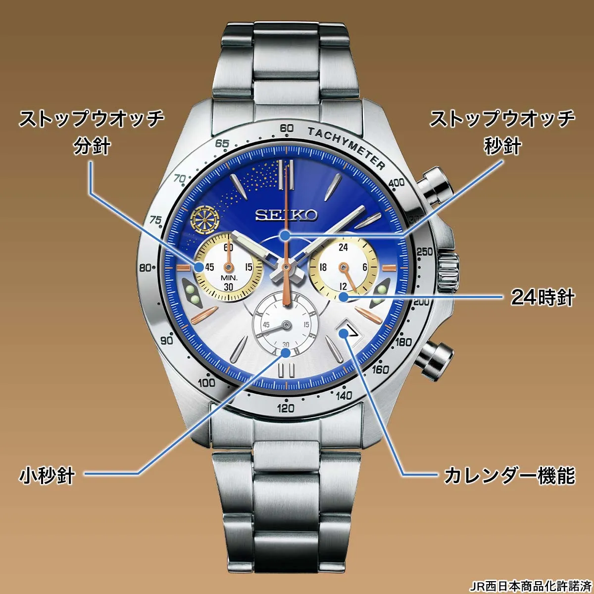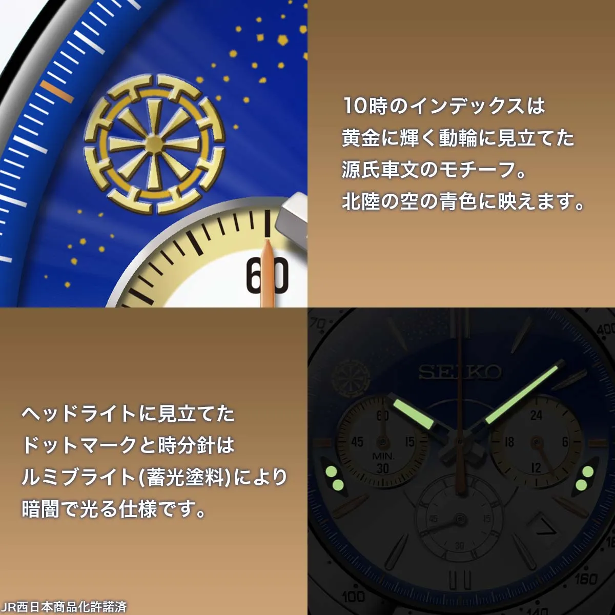 セイコー製のクロノグラフモデルで、ストップウオッチ秒針は車体の帯色と同じ銅色。10時位置に輝く装飾は、W7系かがやきの豪華な内装にも通じる金蒔絵をイメージ。黄金に輝く動輪に見立てた源氏車文のモチーフが時を彩り、つながる歓びを心に刻みます。