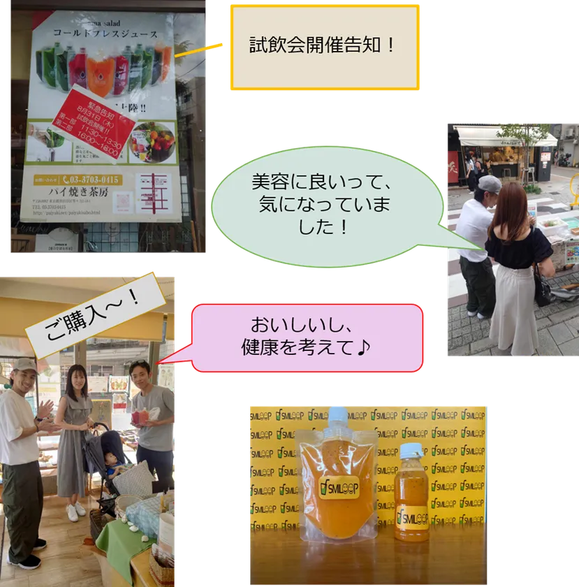 smiloop project のメンバーであるamaサラダは清涼飲料水製造許可取得を強みに野菜や果物をそのまま使用し、高齢者から子どもまで簡単に栄養素を摂取できるコールドプレスジュースを製造しております。