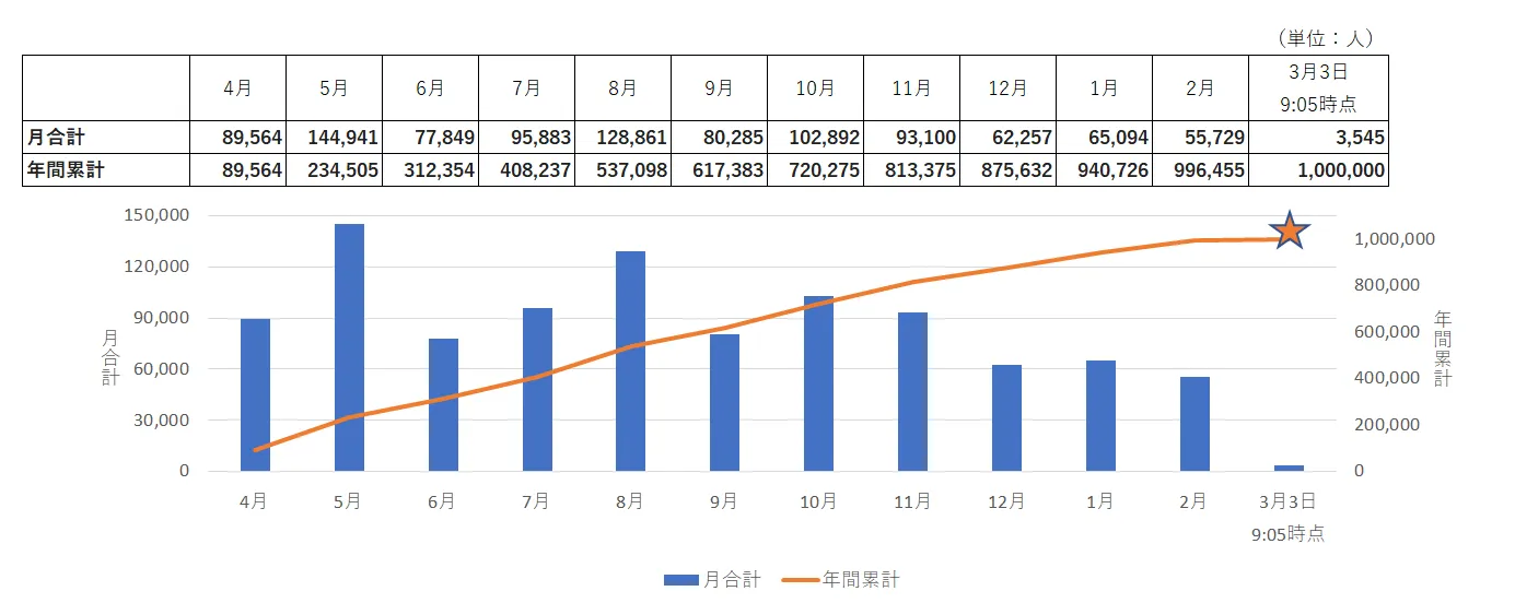株式会社日比谷花壇(本社:東京都港区、代表取締役社長:宮島浩彰)は、当社が代表企業を務めるエリアマネジメント横須賀共同事業体で受託し、2023年4月にリニューアルをし、管理運営を行う「長井海の手公園 ソレイユの丘」(所在地:神奈川県横須賀市長井4丁目)において、2024年3月3日(日)9時5分に、年間来園者が2005年の開園以来初となる100万人を突破しました。