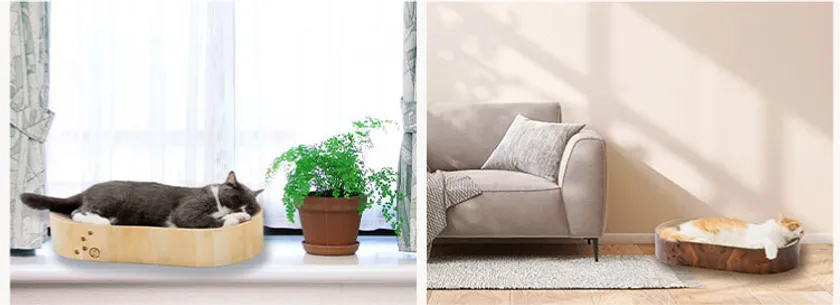 「バリバリボウルXL オーバル」は幅60x奥行33x高さ10cmの横長設計です。すり鉢形状のベッドでのまんまる寝スタイルに加えて、横にのびのびと身体を伸ばして横伸び寝スタイルや、数匹での添い寝も可能に。