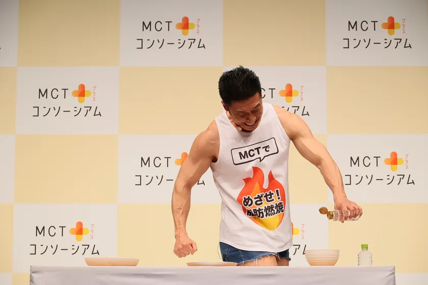 そして、ダイエットに悩む全ての人を応援すべく、なかやまきんに君が応援団長の姿で登場。「今日は応援隊長としてまいりました!押忍!」と意気込みを示した後、見慣れた姿である脂肪燃焼モードのタンクトップ姿へ衣装チェンジしました。そして、MCTオイルとの出会いについて聞かれると「3年前ぐらいに、ボディビルの大会に向けての減量で糖質を抑えた食事をしていた時にエネルギー不足を感じとりいれはじめたのがMCTオイル」ときっかけと語り、「素早くエネルギーになり体脂肪に蓄積されにくく、また、無味無臭だからこそ、どんな料理にも合うため、今でも毎日MCTオイルをとりいれています!」と長年の愛用ぶりを紹介しました。
