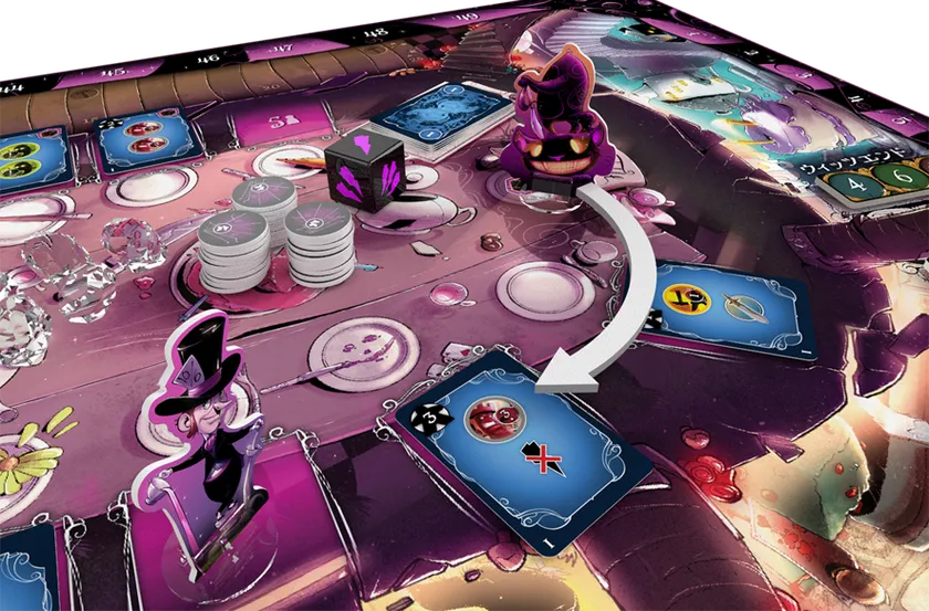 お茶会フェイズではボード上に並ぶカードを取得して不思議の住人や味方を仲間にしたり、戦力値を上げたり、自分の能力を開放したりすることができます。