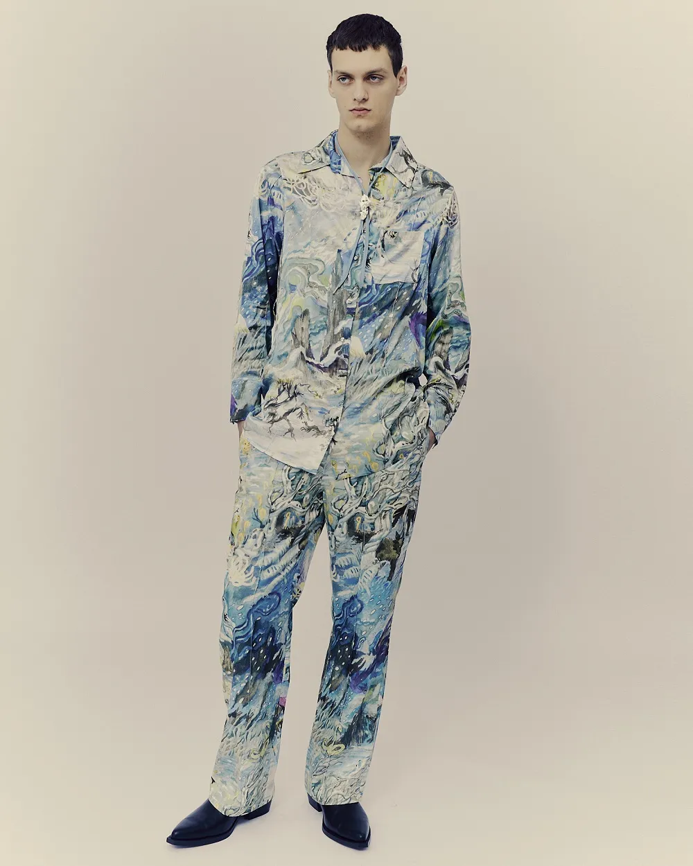 オリジナル作品は、日本の「ファイナルファンタジー」のキャラクターデザインを手掛けるアーティスト、天野喜孝氏にインスパイアされた幻想的なシーンを、水彩かつ手描きで描いており、このたび、オリジナルと同じニュアンスと明るさで生地に印刷されました。今回発表したドレス、スカート、ズボン、シャツはサテンとシフォンから作られており、コレクションのスタイリングに幻想的な雰囲気を醸し出しています。