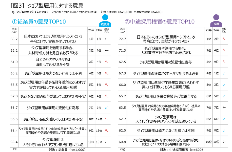 ジョブ型雇用は「号令だけで実態が伴っていない」と、従業員も中途採用権者も厳しい意見が最多。 従業員は雇用への不安が大きく、中途採用権者はジョブ型ならではのメリットに注目