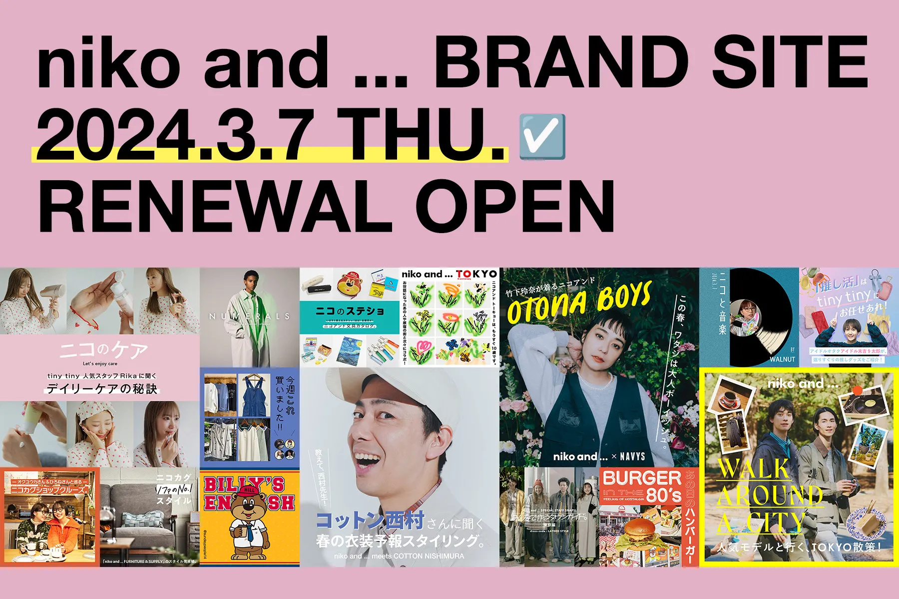 今回のリニューアルは、これまで「niko and ...」が「スタイルエディトリアルブランド」として大切にしている“uni9ue senses”(衣・食・住・遊・知・健・旅・音・LOCAL)をキーワードに、「niko and ...」ならではのちょっとユニークな視点で、ファッションだけでなく、雑貨や家具、飲食、音楽、ローカルといった暮らしを彩る9つのカテゴリーを編集して提案していることをよりブランドサイトで表現していくために実施いたします。