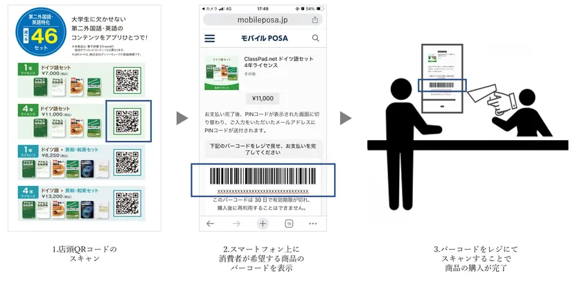 スマートフォンでQRコードを読み込んだ後に表示されるバーコードを店頭レジでスキャンすることで商品をご購入することができます。