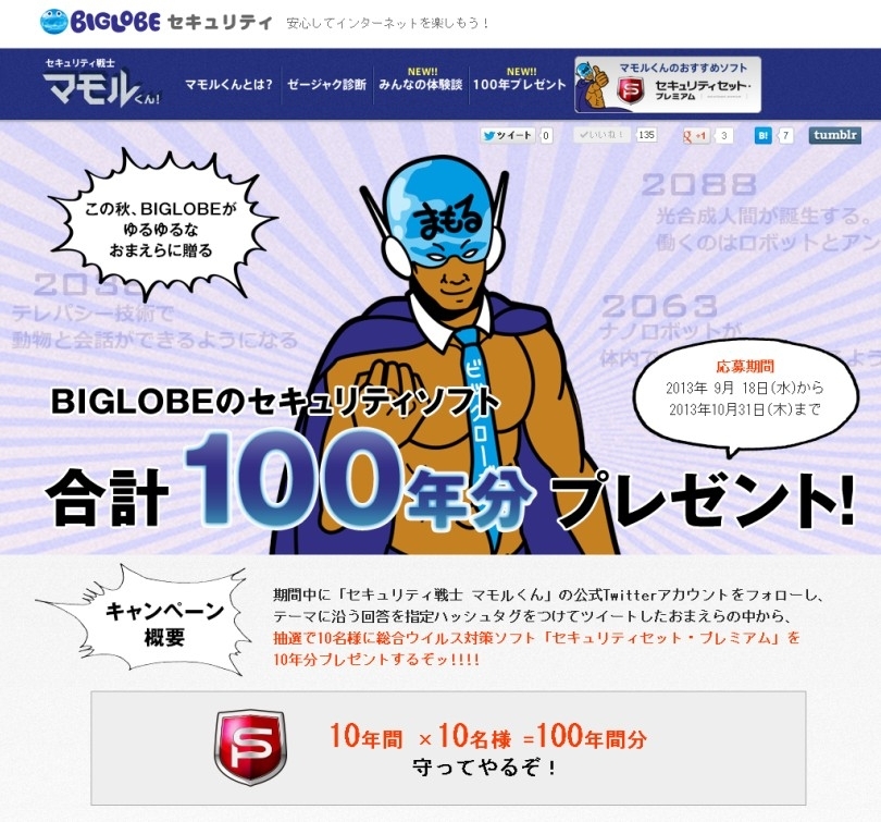 本機能の追加にあわせて、BIGLOBEのセキュリティソフト「セキュリティセット・プレミアム」を合計100年分プレゼントするTwitterキャンペーンや、体験談の投稿者に『セキュリティ戦士 マモルくん』のオリジナルグッズをプレゼントするキャンペーンも開始いたします。