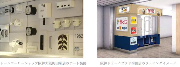 駅ナカ店舗でも阪神電車をお楽しみいただけるよう、ドトールコーヒーショップ阪神大阪梅田駅店では、「青胴車」、「ジェット・カー」の愛称で親しまれてきた5001形車両の部品をアートとして内装に活用します。また、阪神ドリームプラザ梅田店では、店舗外装に同車両のラッピングを施します。