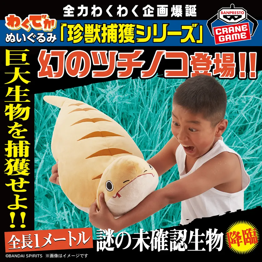 ウワサの“珍獣”、蛇のような容姿をした「幻のツチノコ」をはじめ、東京湾近海に生息するらしい「やさしいエイ」、オオクワガタを越えるサイズの「オオキイクワガタ」、郊外の用水路に潜むとされる「巨大アメリカザリガニ」が、サイズ約100cmの大きな『わくわくでっかいぬいぐるみ』になって新登場します。(発売元:株式会社BANDAI SPIRITS)