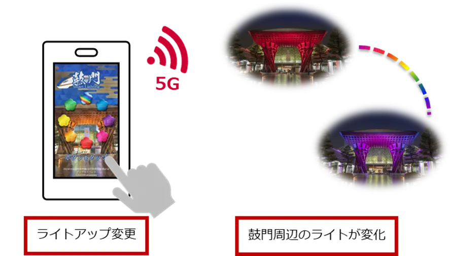 5G通信やIoT技術を用いて、鼓門をインタラクティブにライトアップします。鼓門周辺に用意されるタブレットを用いて8パターンの選択肢から、イベント参加者が自分の好みのライトアップに変更ができ当日だけの特別感のあるライトアップや写真撮影が可能となります。