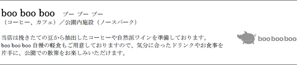 「都市公園の季節ごとに変化する景色を楽しみながら食事をする」という体験を提供する施設で、うめきた公園サウスパークの3店舗と同ノースパークの1店舗の合計4店舗を、それぞれ利便性の高い公園の入口付近に設置します。また、カフェ&レストラン「SIK eatery」やカフェ「boo boo boo」などでの軽食・飲料のテイクアウトや、テラス席でのお食事など公園ならではの楽しみ方も充実しています。
