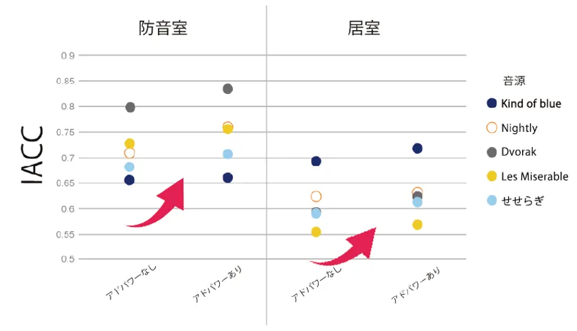 IACC:Inter Aural Correlation Coefficientの略で、音の広がり(拡散度)を現す指標。