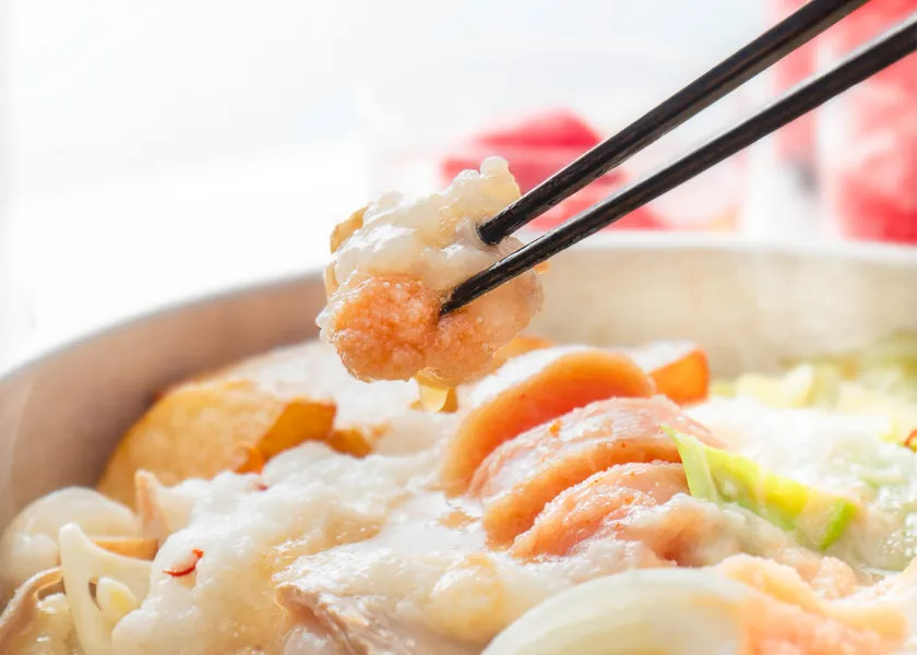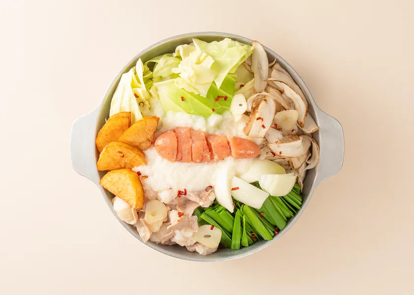 あごだし醤油味のスープをベースに、国産牛もつ、新玉ねぎ、じゃがいも、キャベツ、ニラ、ごぼうなど旬の野菜を加え、やまやの辛子明太子を1本贅沢に使用いたしました。仕上げにとろろをかけると見た目も春らしく、あっさりとした味わいの中に旨みが凝縮されたコク深い味わいです。辛子明太子をスープに馴染ませながらお召しあがりください。〆は雑炊がおすすめです。
