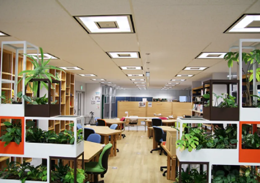 クリエイティブスペース。手前左右のグリーンは大和リース株式会社がMONOの工作室で製作、商品化された室内緑化システム「iG」
