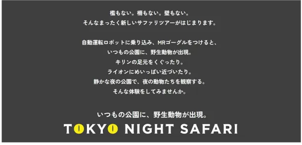 株式会社ZMP(代表取締役社長:谷口恒、以下ZMP)、NTTコミュニケーションズ株式会社(代表取締役社長:丸岡亨、以下NTT Com)、株式会社フューチュレック(CEO:神田宗秋、以下フューチュレック)、株式会社博報堂(代表取締役社長:水島正幸、以下博報堂)が共同推進する、ロボットと生活者が共生する新たな風景を目指す「Robo-Village」プロジェクトは、第一弾サービスとしてXRで動物たちを間近で楽しむことができるライド型のナイトサファリパーク「TOKYO NIGHT SAFARI(トウキョウ ナイト サファリ)」の事業検証を開始します。