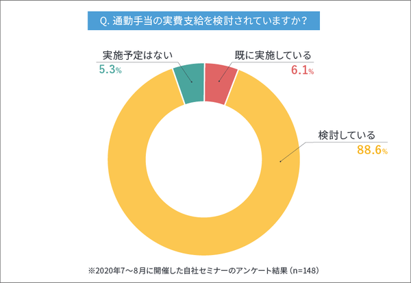 現在、テレワークの常態化により、出勤日数に応じた通勤手当の実費支給を実施・検討する会社が増えています。
