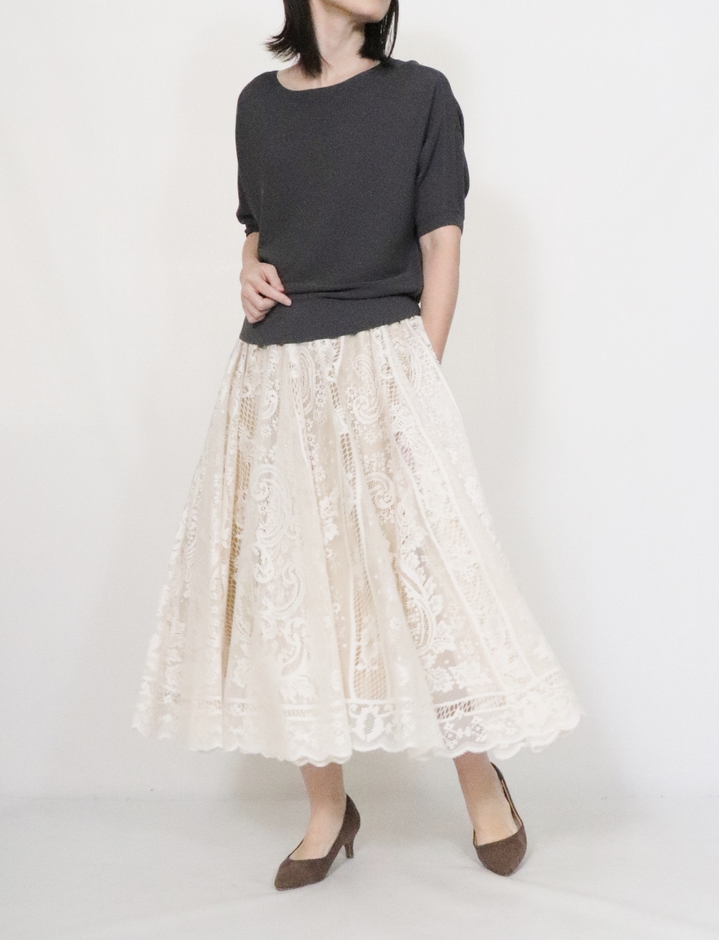 このレース生地は編み上げているため伸縮性があり、接ぎ目のない一枚の生地なので身体に馴染みやすく、ストレスのなり着心地です。黒のレースにはグレー、オフホワイトのレースにはキャメルベージュと明るい裏地を付け、視覚的奥行きを持たせることでレースが引き立つようにしています。ウエストはゴム仕様なので着心地も抜群です。フェミニンな印象になりがちなレースですが、上品な大人の印象に仕上げました。
