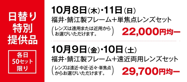 福井・鯖江製フレーム+レンズセットを各日50セット限り、お買得価格にてご用意いたします。福井・鯖江のメガネは掛け心地の良さはもちろん、カラーやデザインにもこだわって作られています。
