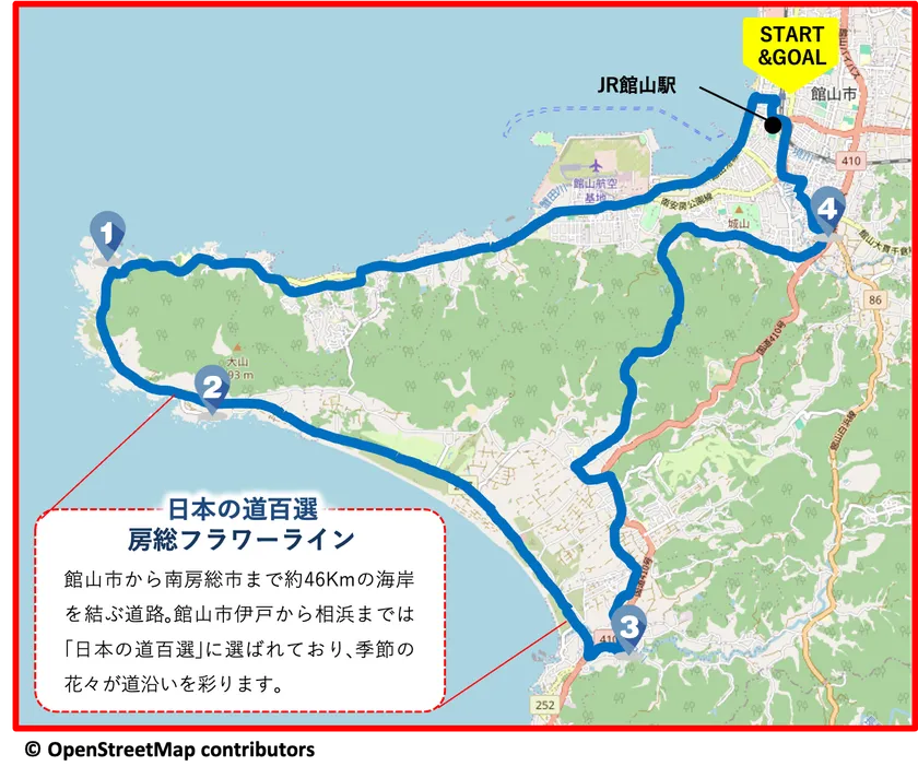 館山駅を起点に、潮風を感じながら海岸線沿いの道や、季節の花々が咲き誇る房総フラワーラインを駆け抜ける気分爽快なコースです。