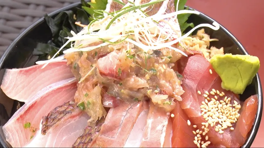 自前の漁船で獲れた鮮度抜群の地魚料理を味わえる海鮮食事処。日替わりの新鮮なネタを盛り付けた名物「定置網丼」はエネルギーチャージにおすすめ!