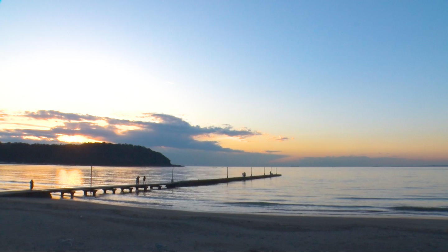 旅の締めくくりは千葉を代表する絶景スポット「岡本桟橋(原岡桟橋)」。全国でも数少ない木製の桟橋の向こうには、天気が良ければ海越しの富士山の姿も望めます。特に、マジックアワーの空の色は美しく、観光客やサイクリストに人気のスポットです。