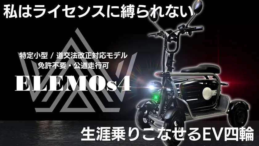 免許不要で公道が走れる。特定小型EV四輪「ELEMOs4」発売。 ~3月9日よりMakuakeにて先行販売開始。 全世代が“簡単”かつ“便利”に乗りこなせるスマートな四輪を。~