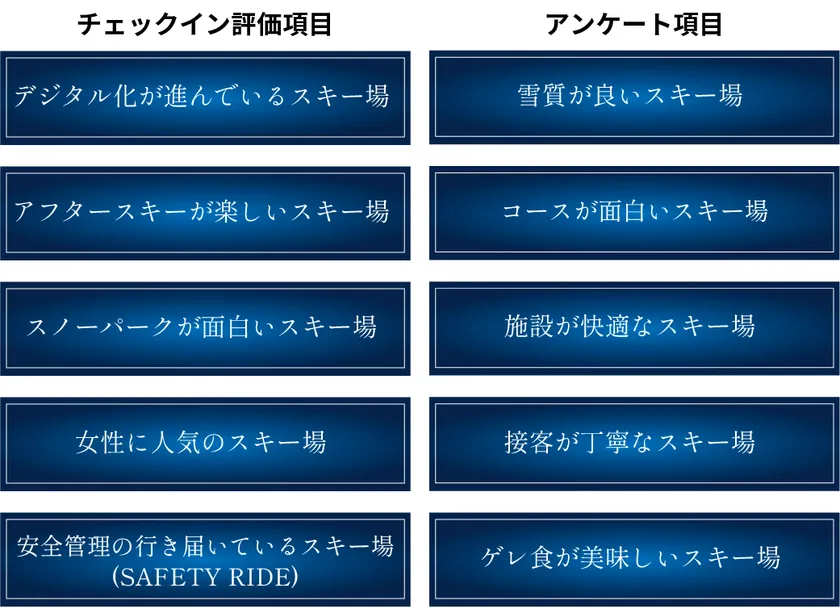 「yukiyama FAN AWARD」ではユーザーがスキー場を滑走後に行うチェックイン評価5項目とユーザー投票によるユーザー投票アンケート5項目の計10項目に基づき、今シーズンの人気スキー場ランキングを決定いたします。