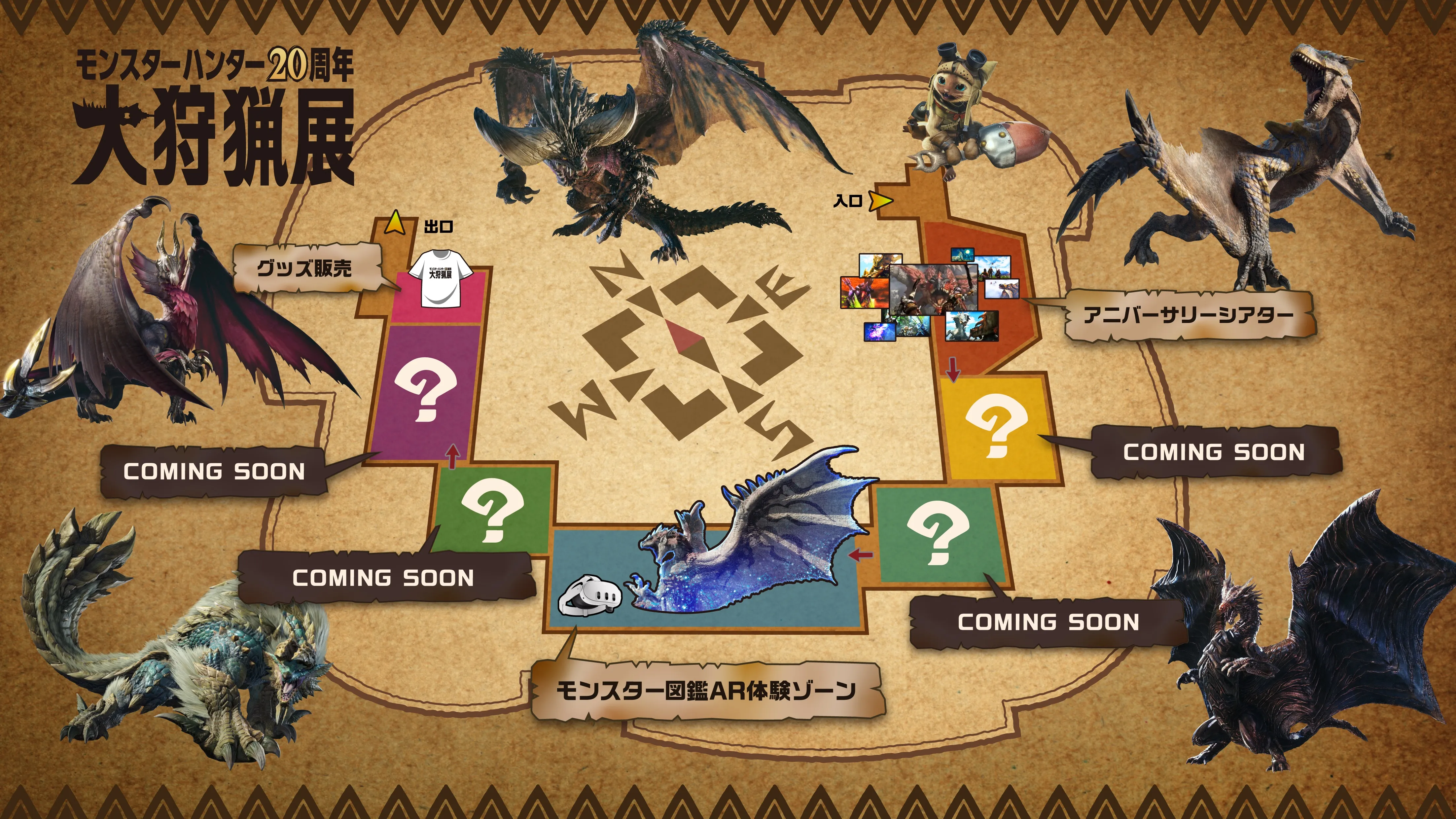 本展覧会では、「モンスターハンター」の20年間の開発データを活用し、アニバーサリーシアターや、モンスター図鑑AR体験ゾーン、大狩猟展を記念したグッズの販売など、「モンスターハンター」の世界観を味わうことのできる様々なコンテンツをご用意しております。