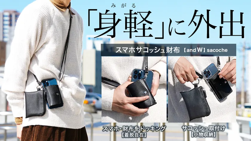 今回、スマホ・財布だけでなく、「サコッシュ」まで後付する、スマホサコッシュ財布「and W」sacocheをリリースいたします。普段持ち歩く小物をサコッシュに収納することで、より身軽でミニマルな装いが可能となります。