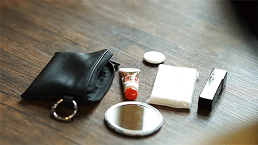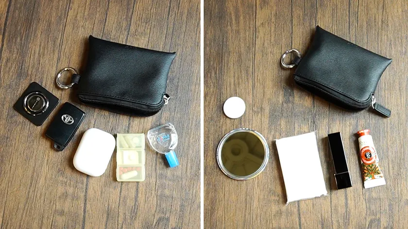 右:スキンクリーム・リップ・ミニポケットティッシュ・ハンドミラー・AirTag
