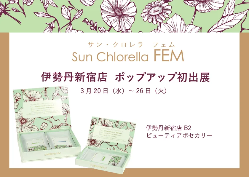 株式会社サン・クロレラ(本社:京都市下京区、代表取締役社長:中山 太、以下「サン・クロレラ」)は、2024年3月20日(水)~26日(火)の1週間限定で、伊勢丹新宿店 本館地下2階 ビューティアポセカリーにてポップアップを開催します。フェムケアに特化した商品を中心に、肌の潤いを保つ機能性表示食品など、特に20~50代を中心とした女性におすすめの商品をご紹介いたします。またこの期間だけのお得な特典や試食もご用意しています。