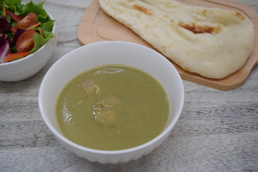 ピリッとした爽やかな辛みとココナッツミルクのまろやかな甘さがクセになる風味豊かなチキンカレーです。ほうれん草で鮮やかな緑色を引き出しました。
