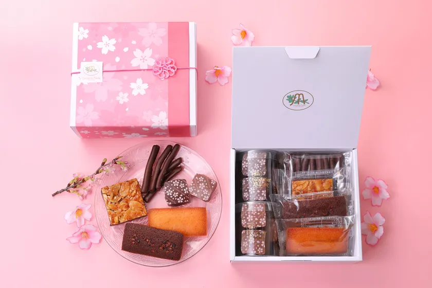 ショコラティエ マサール一番人気のショコラブラウニーに春限定の桜柄をほどこし、個包装でご用意。春らしい掛け紙をかけた、贈りものにピッタリなセットです。箱を開けると桜の花が満開に。新生活のお祝いにオススメのギフト。