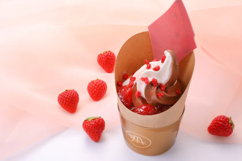 自家製イチゴのコンフィチュールを小麦粉不使用のチョコレート生地やチョコレートソースと混ぜ合わせ、その上からマサールのソフトクリームを巻きました。