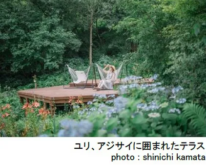SIKIガーデン内「せせらぎのメドウ」エリアでは、カマシアが咲き、一面に爽やかな紫色の花畑が広がります。森のCafe(※1)では窓一面に咲くオオデマリを鑑賞でき、テラス席ではヤマツツジを背景にお茶や食事を楽しむことができます。