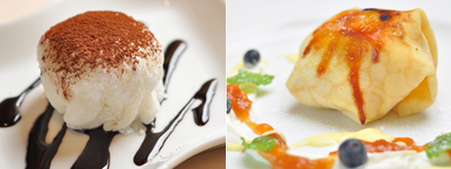 京都の代表的な和菓子・生八ツ橋をマスカルポーネアイスと一緒にクレープで包みました。生八ツ橋のもちもちした食感とマスカルポーネのまろやかさが絶妙にマッチ。見た目は洋風ですが、梅のソースと生八ツ橋で和風なデザートに仕上げました。